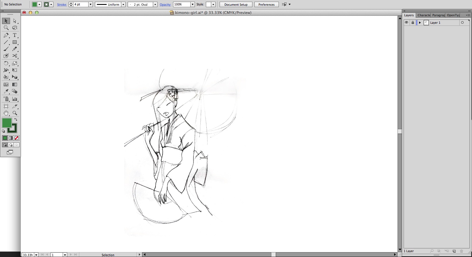 Download handmade.jpg onto your hard disk, open Adobe Illustrator, go to File > Place and select handmade.jpg. The sketch will appear on your blank page. You’ll need to block this image Object > Lock so that you can add vectors without moving the image below.