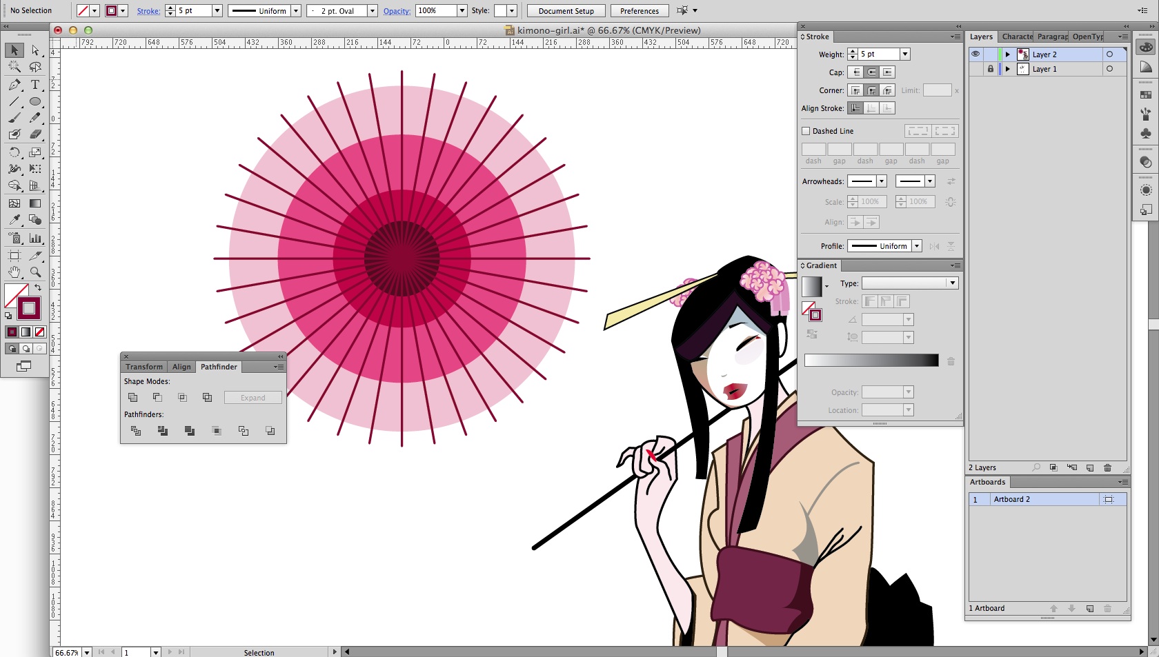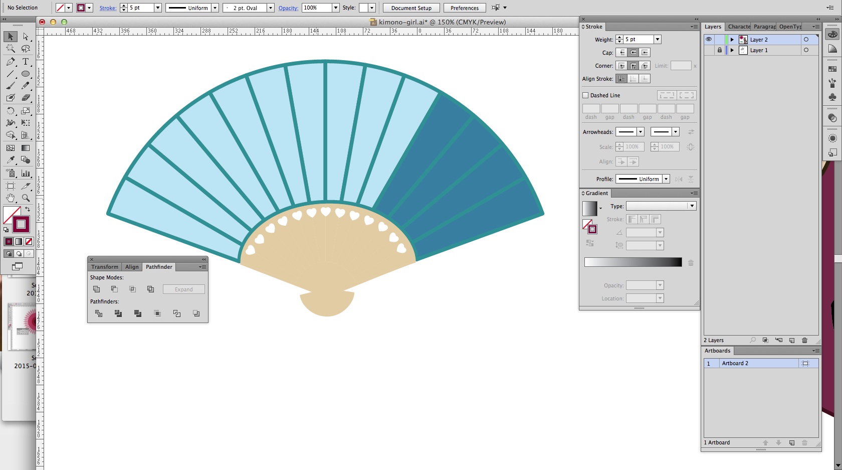 Design a crown of hearts using the Rotate/duplicate method used for the flowers and the bars, place it on top of the wooden handle and click Divide in the Pathfinder window, Now with the Direct Selection tool (A) Select and Cancel the heart shape to create holes. Group the whole fan and place it under the girl’s hand.