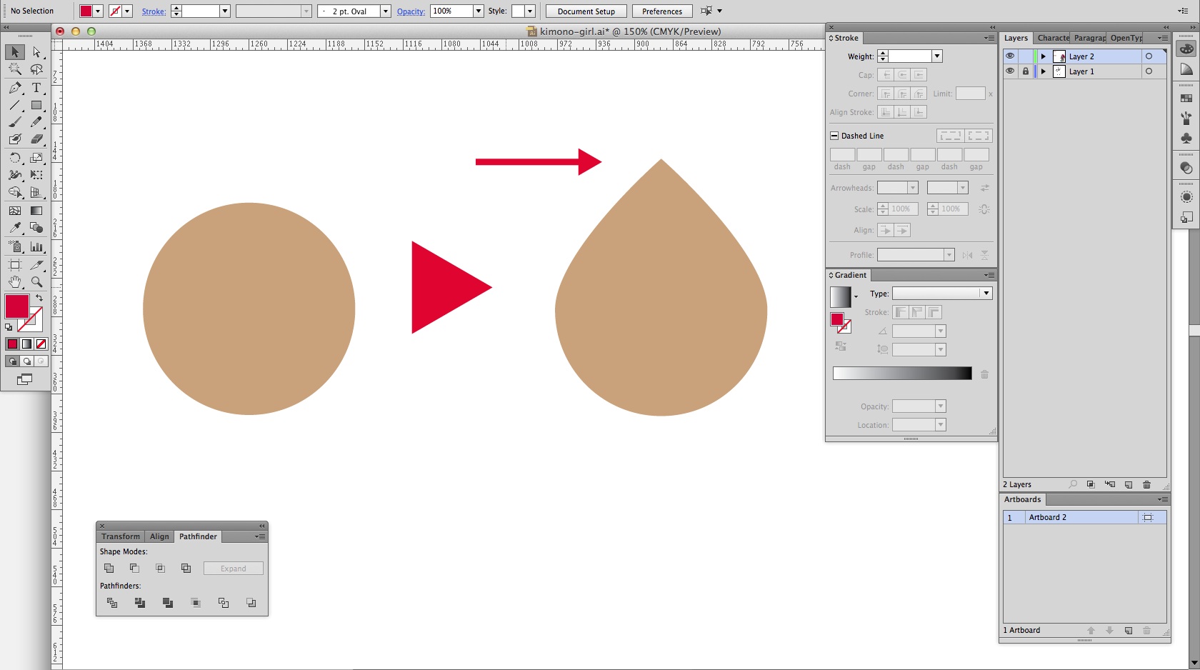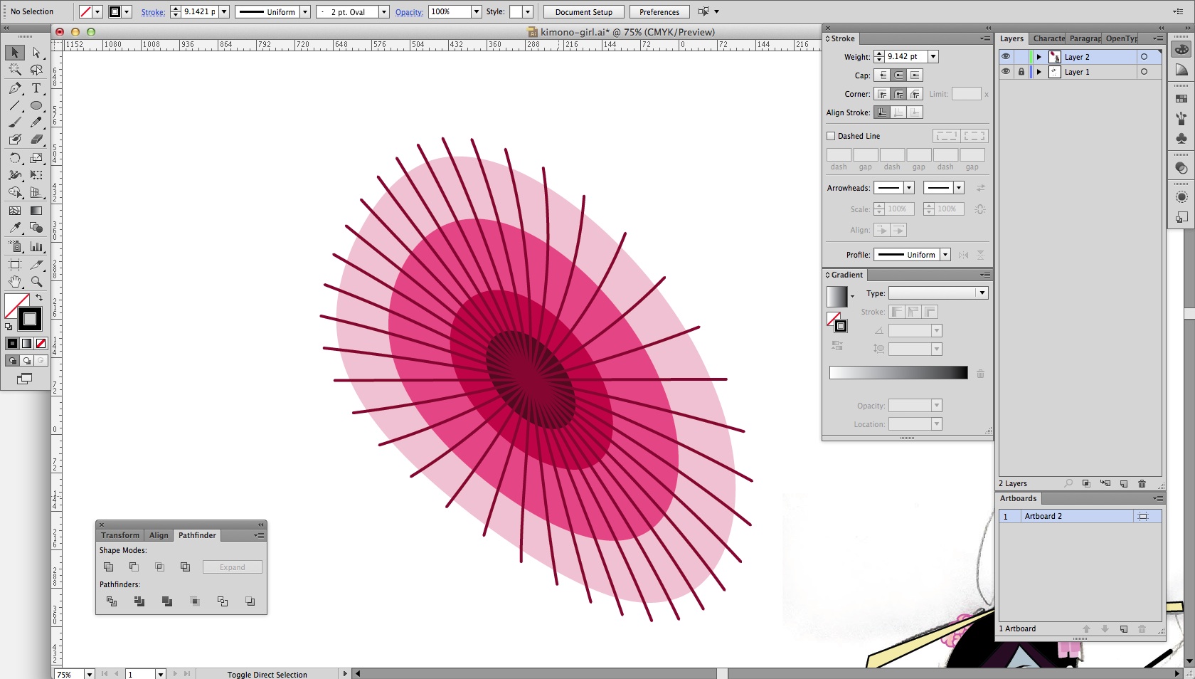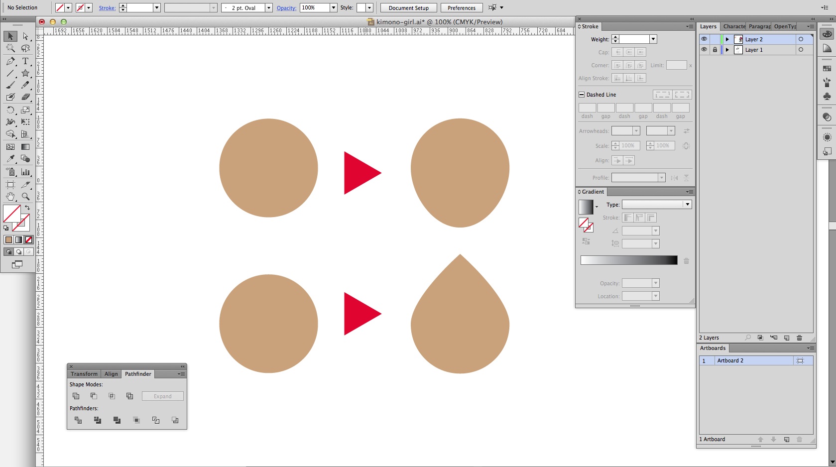 You can now work on the decoration of the girl’s kimono. First design two different petals, Starting from a circle, you can use the white arrow (A) to select one anchor point and drag it, or distort the circle using the arrows on your keyboard.