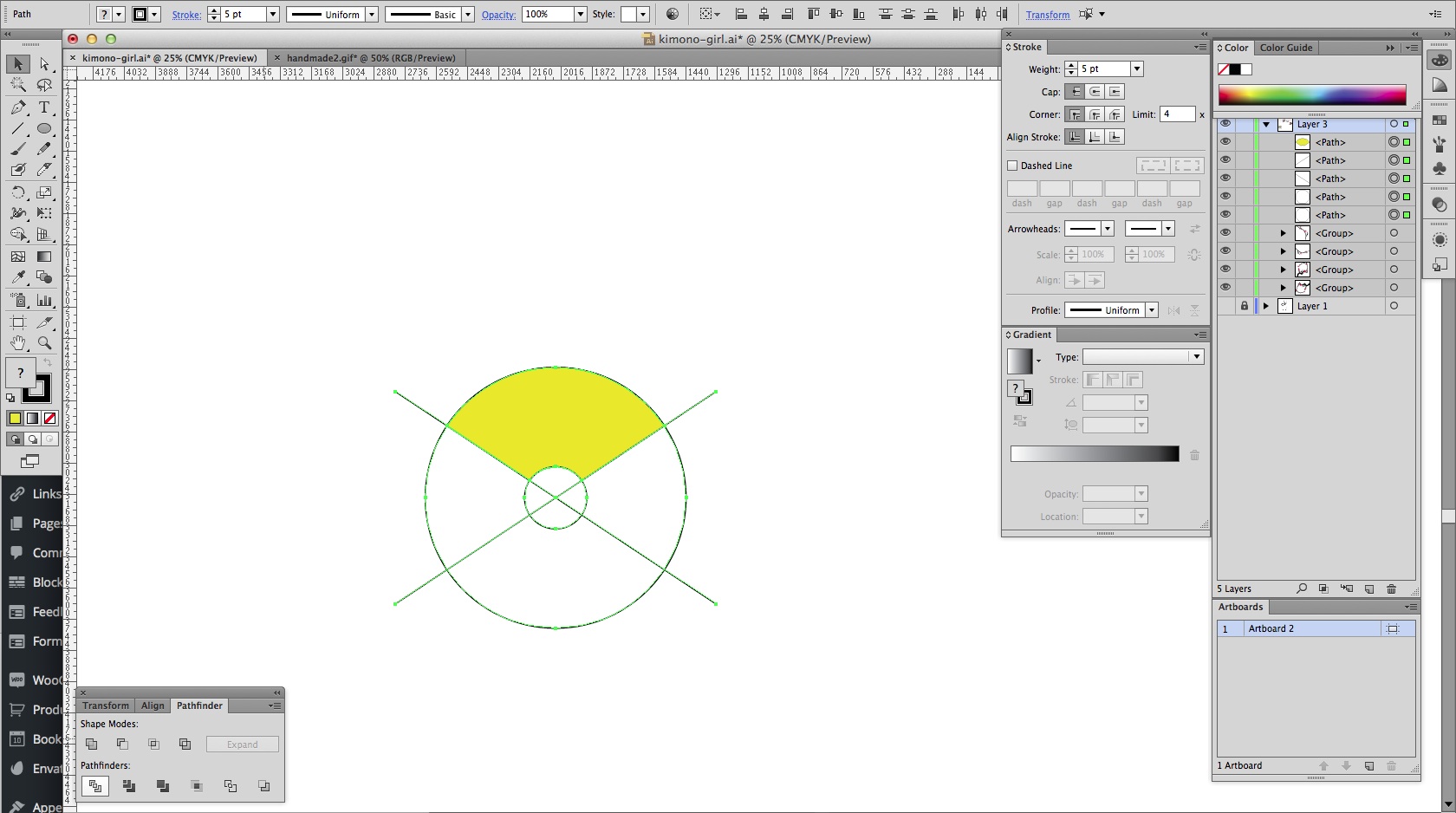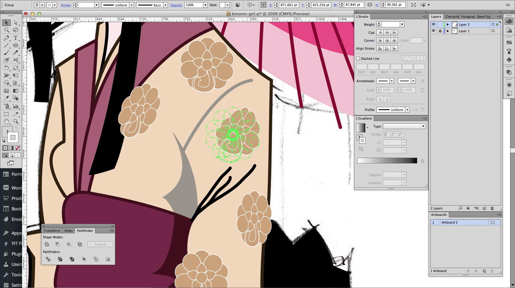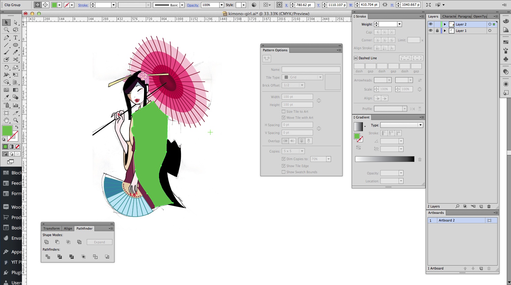 Select the green area and the grouped decoration and go to Object > Clipping Mask > Make, The decoration will now be masked. Repeat for the other parts of the kimono where the decoration can be seen.