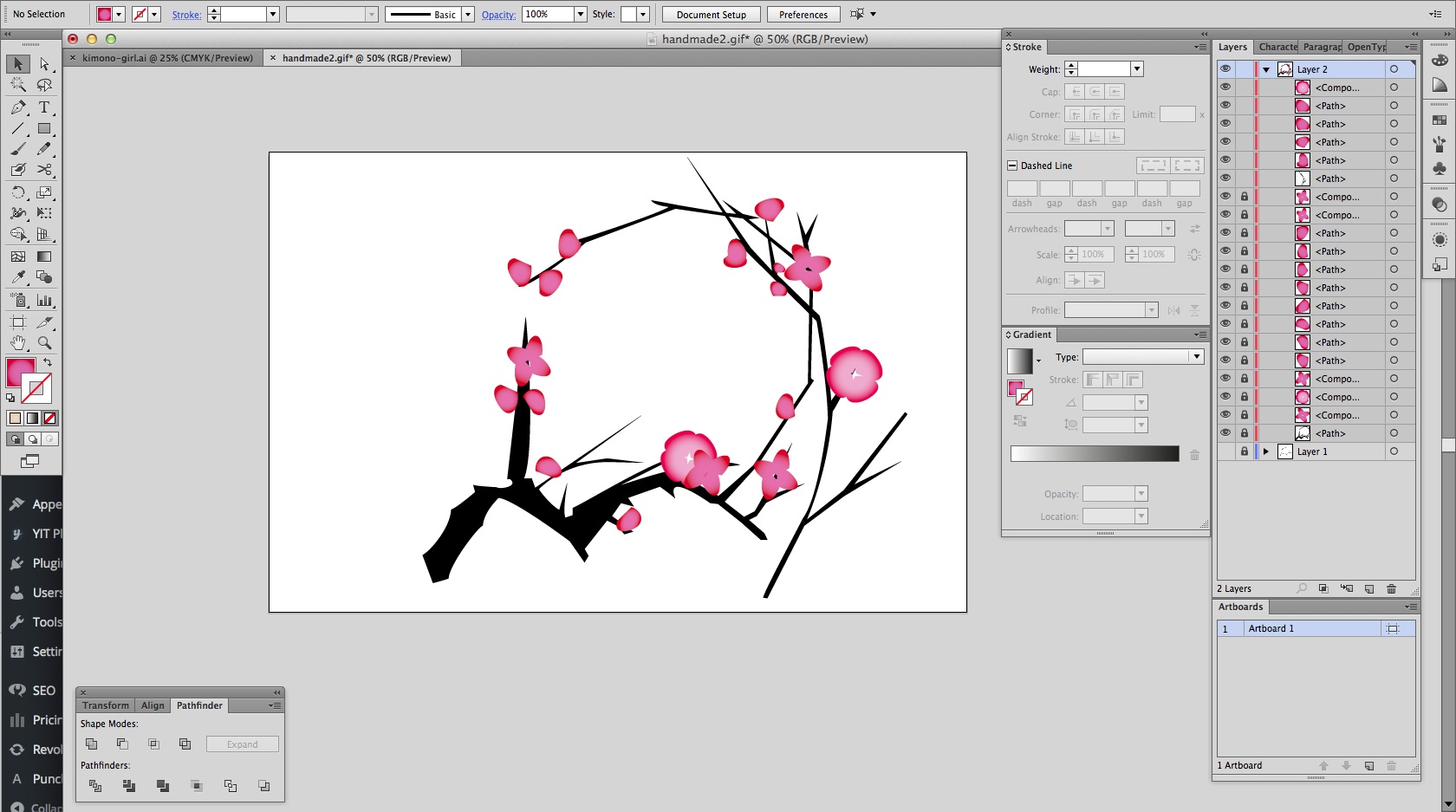 To design the cherry branch, open handmade2.gif into Illustrator, It’s good to have these scans in low resolution so that the CPU will work is easier. You can now start to trace the image with the Pen tool (P).