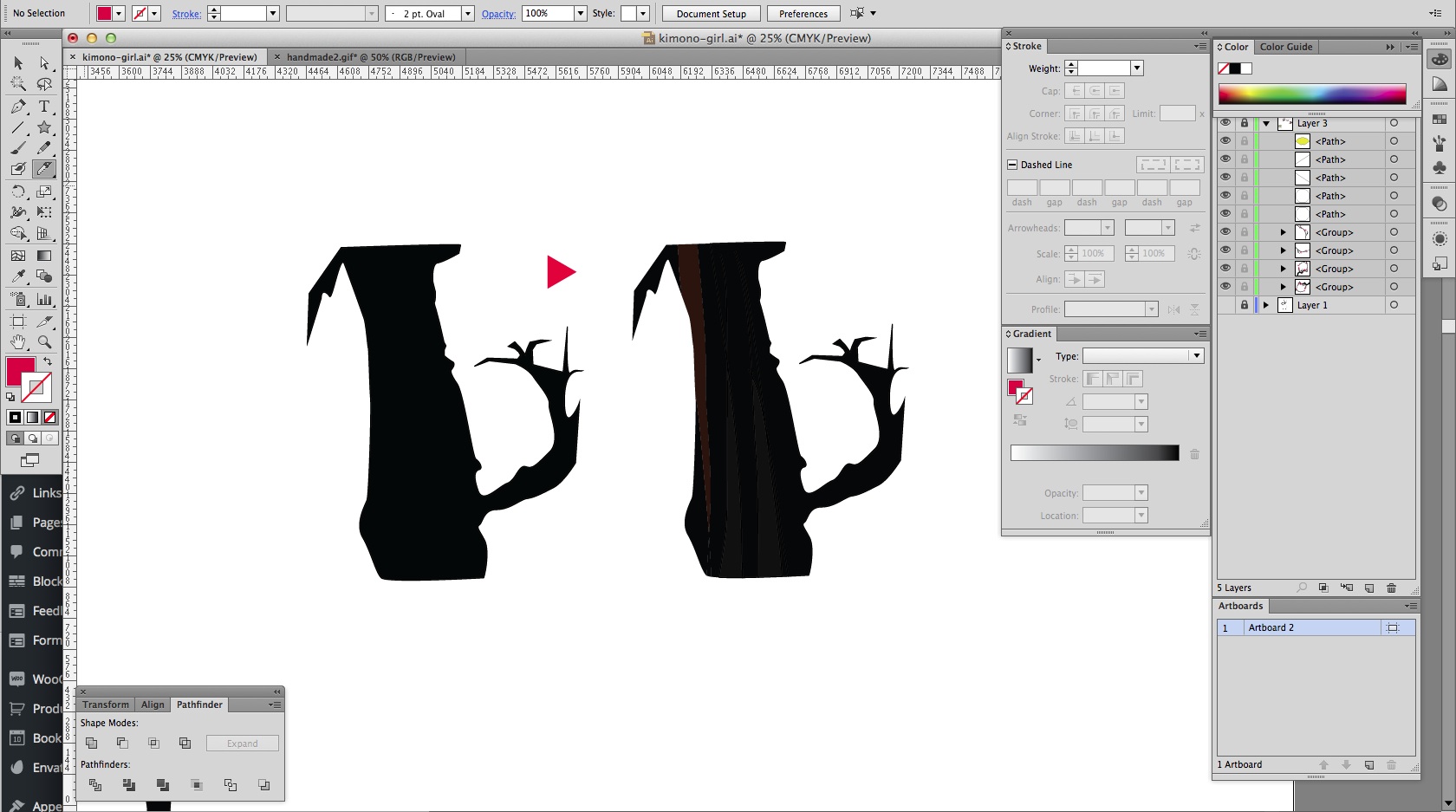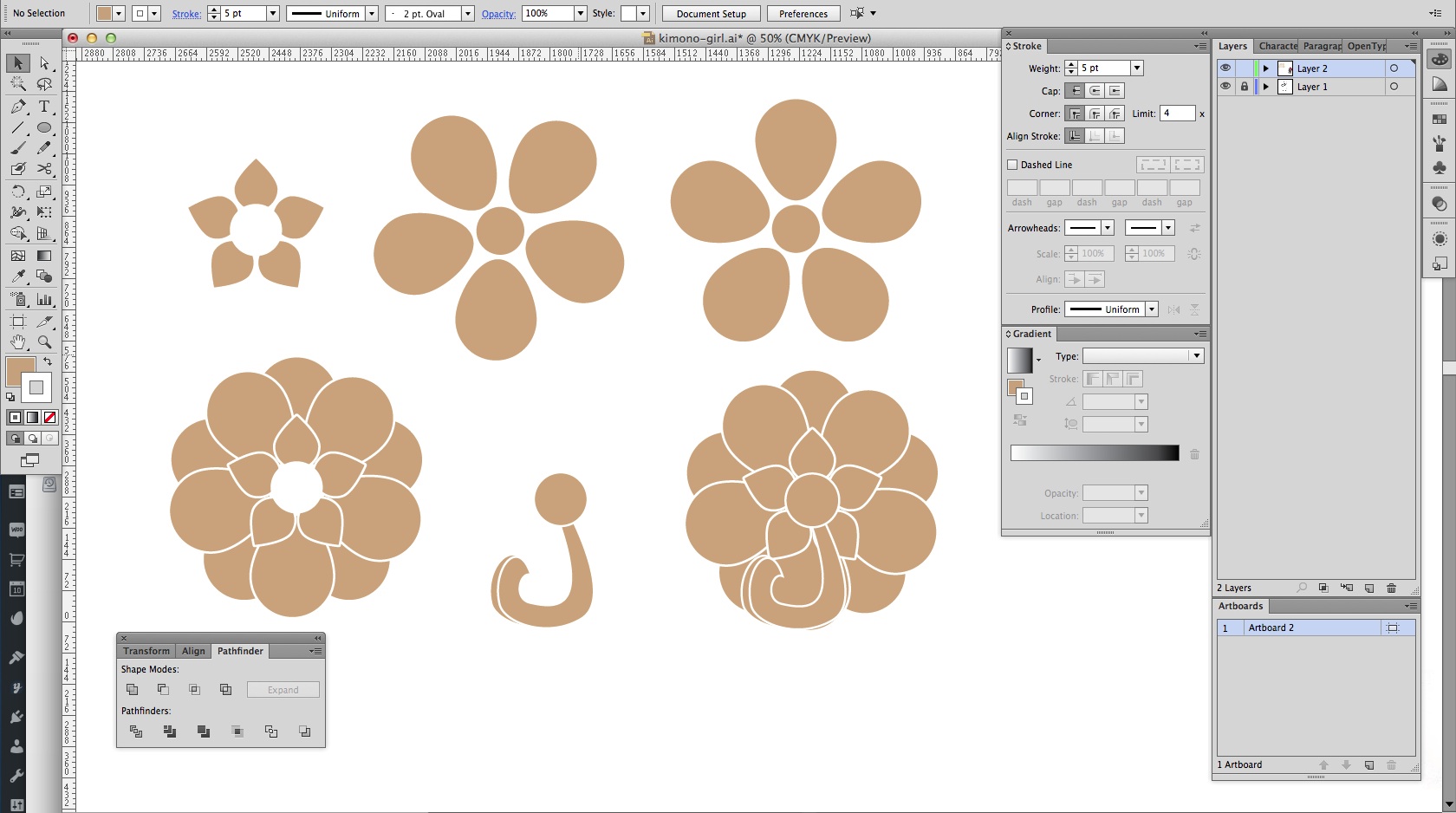 Once the branch is complete, you’ll need to start on the red/pink flowers. This effect can be easily achieved using the Pencil tool (P). Trace them, select the paths and use Pathfinder > Merge to close the path, Using the Direct Selection tool (A), select any superfluous parts and cancel them with the Backspace key on your keyboard.