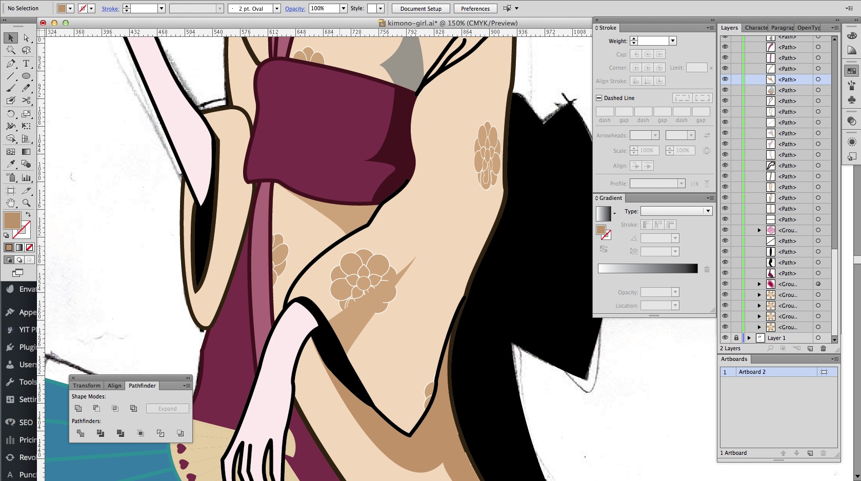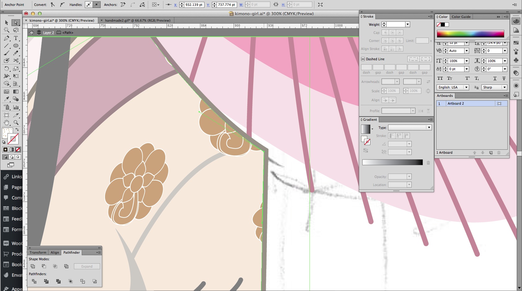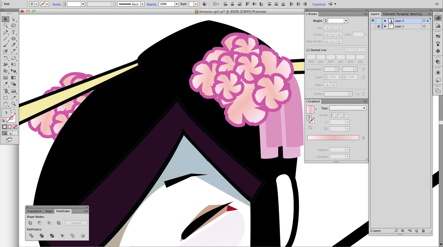 Make the mask smaller in certain points so that the decoration does not cover any part of the stroke. Using the Direct Selection tool (A), click on the white spots, and drag and move the direction lines until the stroke of the kimono is uncovered.