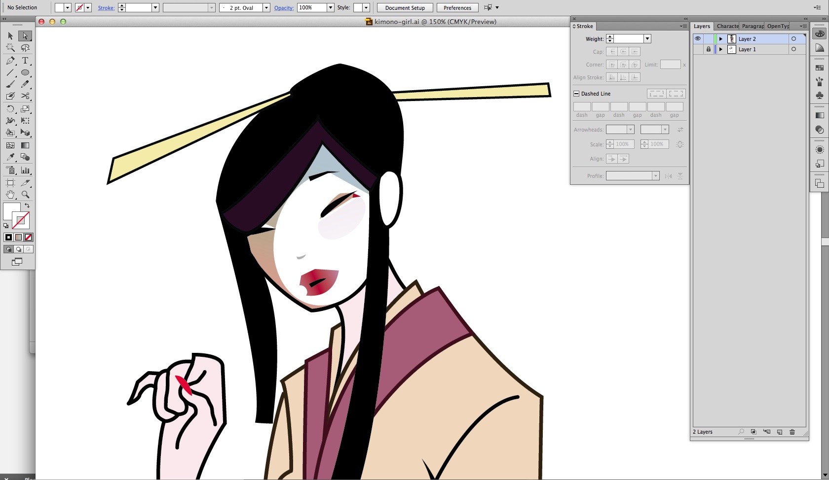 Colour the whole image using the Eyedropper Tool (I) and start to add some detail. By using the black arrow (V) and Shift, you can select all the parts that will use the same colour – the soft pink of the hands and neck for example. Use the Pencil tool (P) for smaller light reflections and areas of shade.
