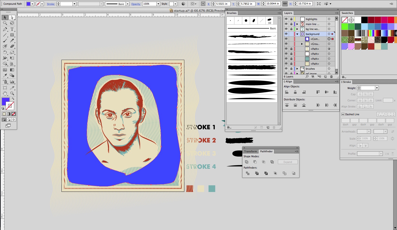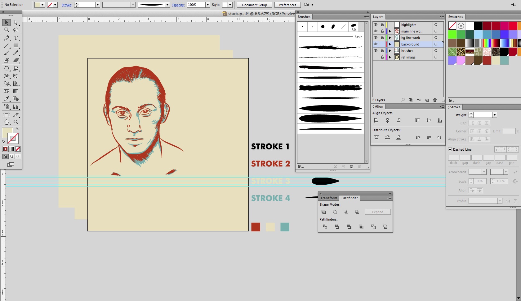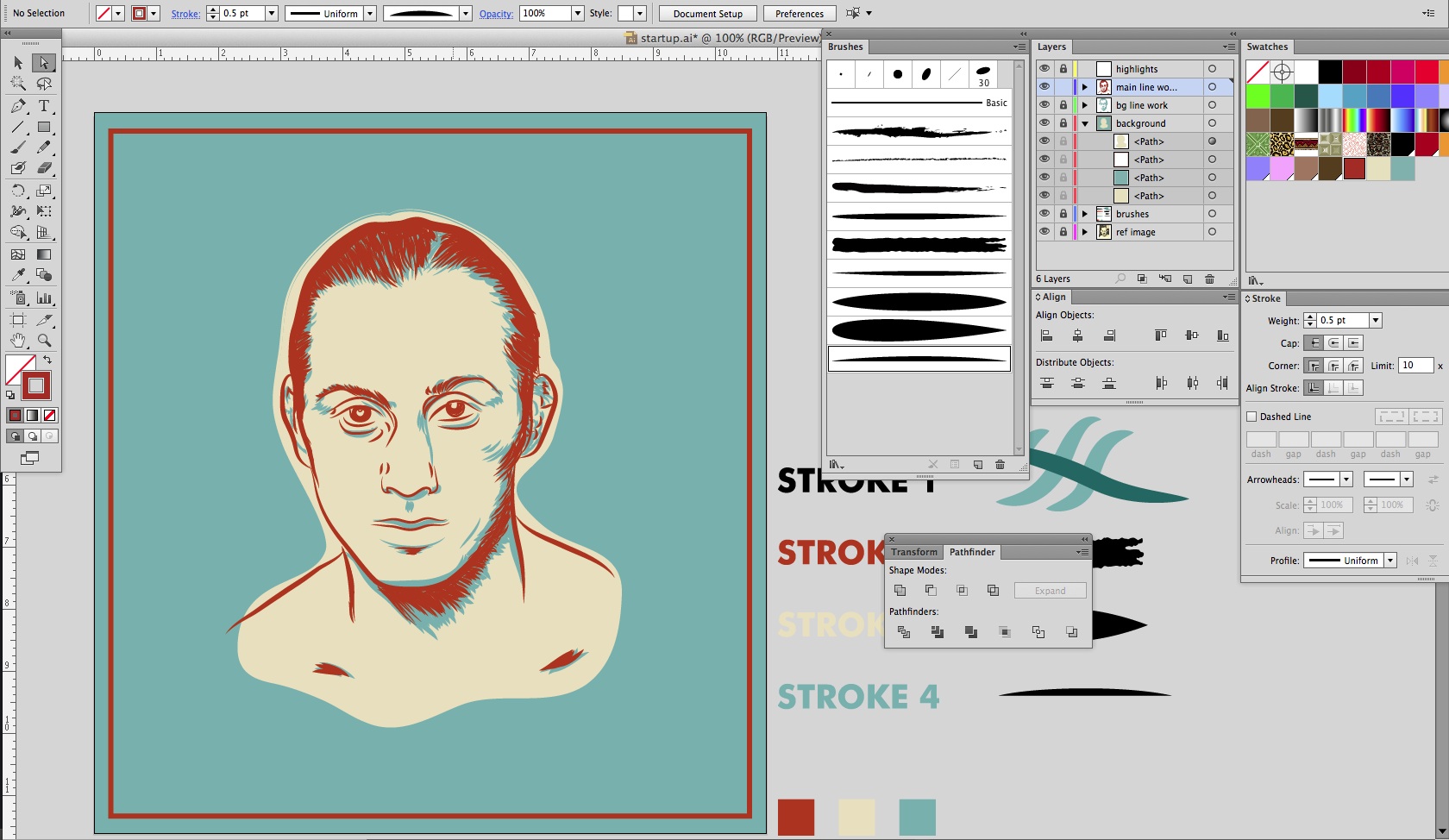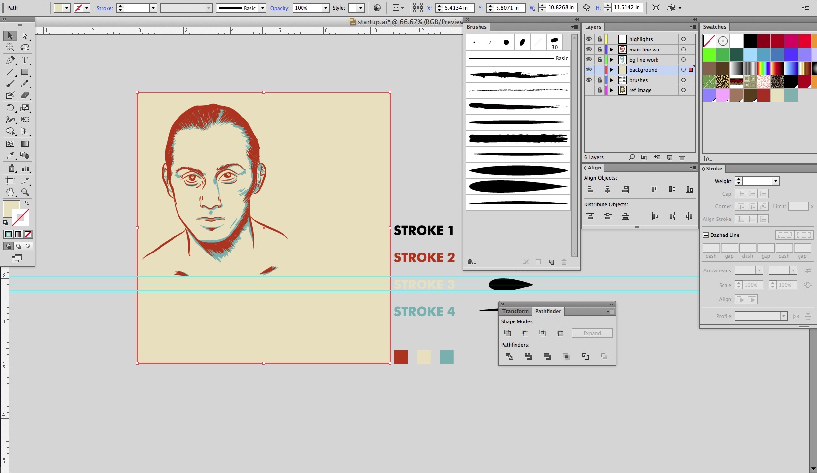 Using the pencil tool, draw a rough outline in your lightest colour around the portrait. This shape should be both filled and stroked. I used a chunky brush to imply texture, but experiment with the brushes you made to see if you can improve on the design.