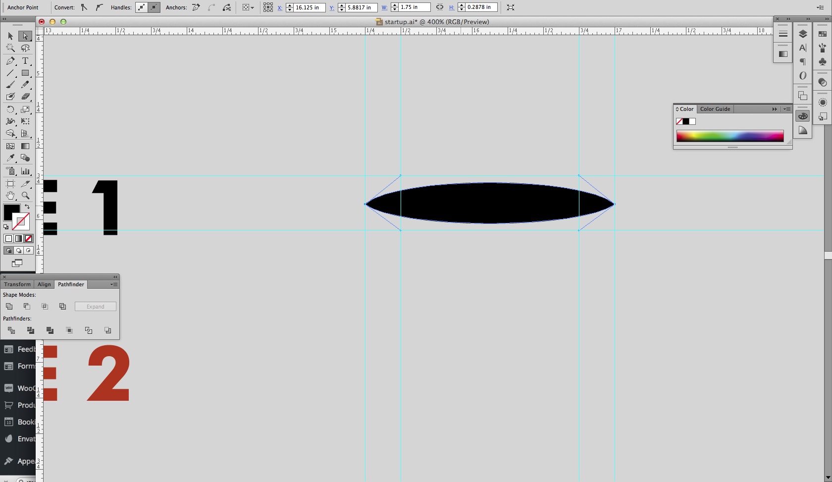 Building a brush is easy! Visualize the stroke you’re after and then picture it compressed. For the first brush, you’ll need a long thin-thick-thin stroke, so build that shape with the Pen tool. Try to keep it small and to scale with the example.