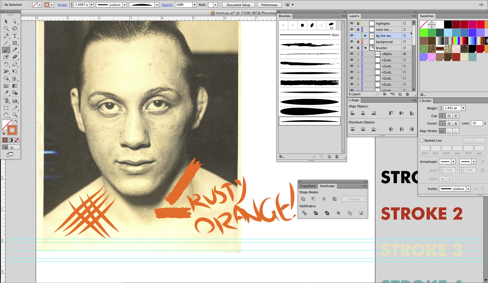 You can now add the copy. The Internet is your buddy here. Use it to gather names, dates, and other elements that can add authenticity to your design. When you are happy, select the type and press Shift+Ctrl+O to create outlines. Stroke these outlines with your chunky brush to enhance the type.