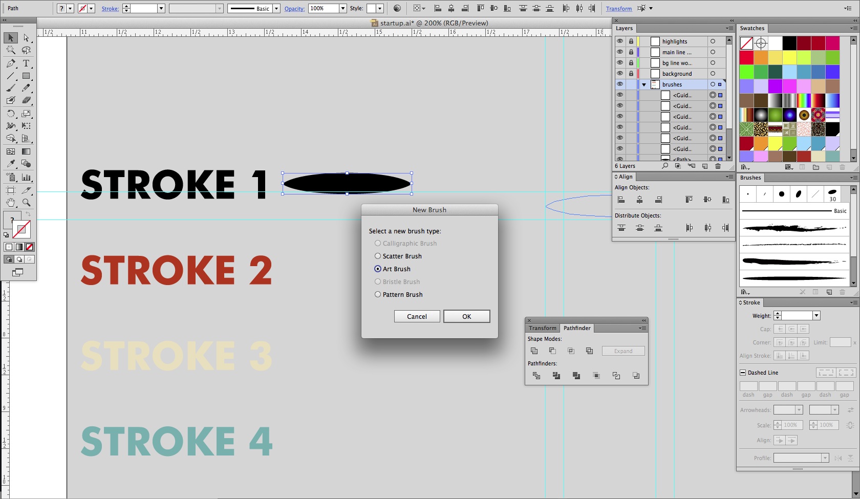 In this tutorial, you’ll do lots of layer locking and unlocking. It may seem like overkill, but it saves a million accidental selections! Open startup.ai, provided in the download in Illustrator. Once open, Select and Unlock the “brushes” layer. This is where you’ll build your new brushes.