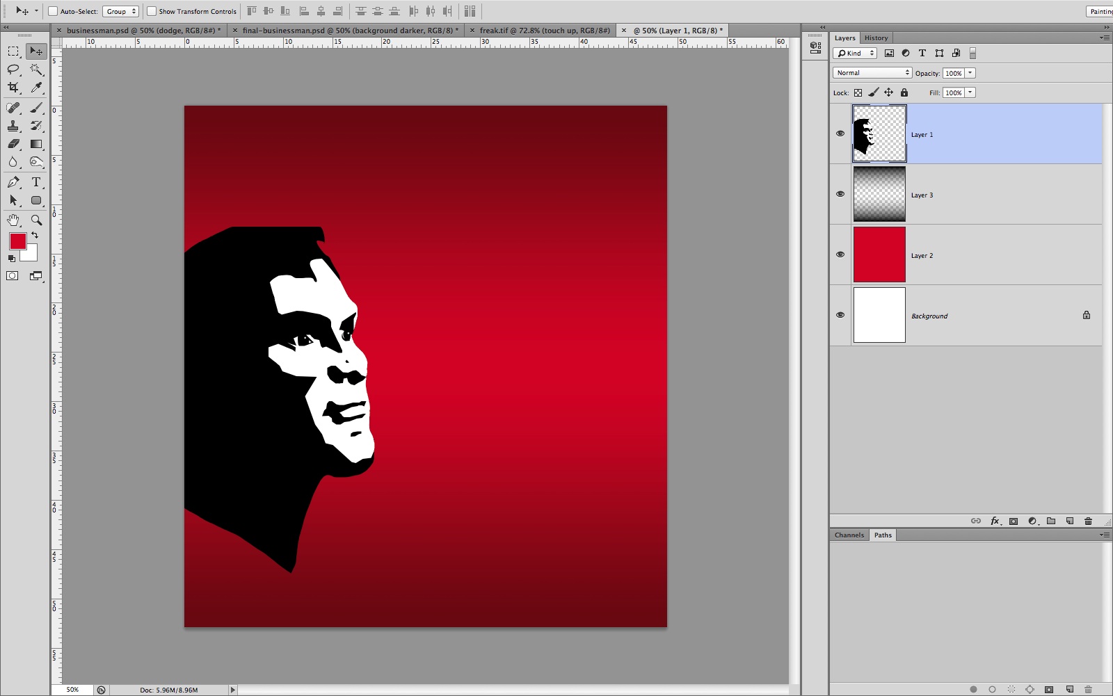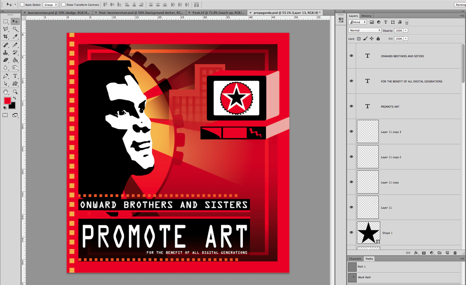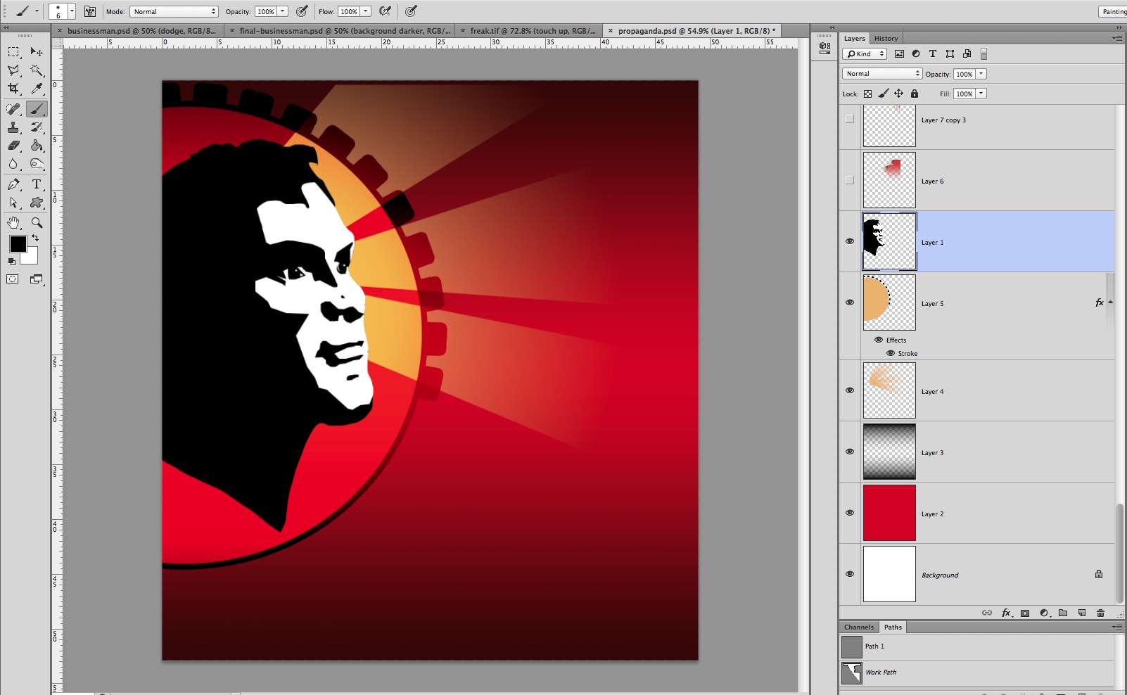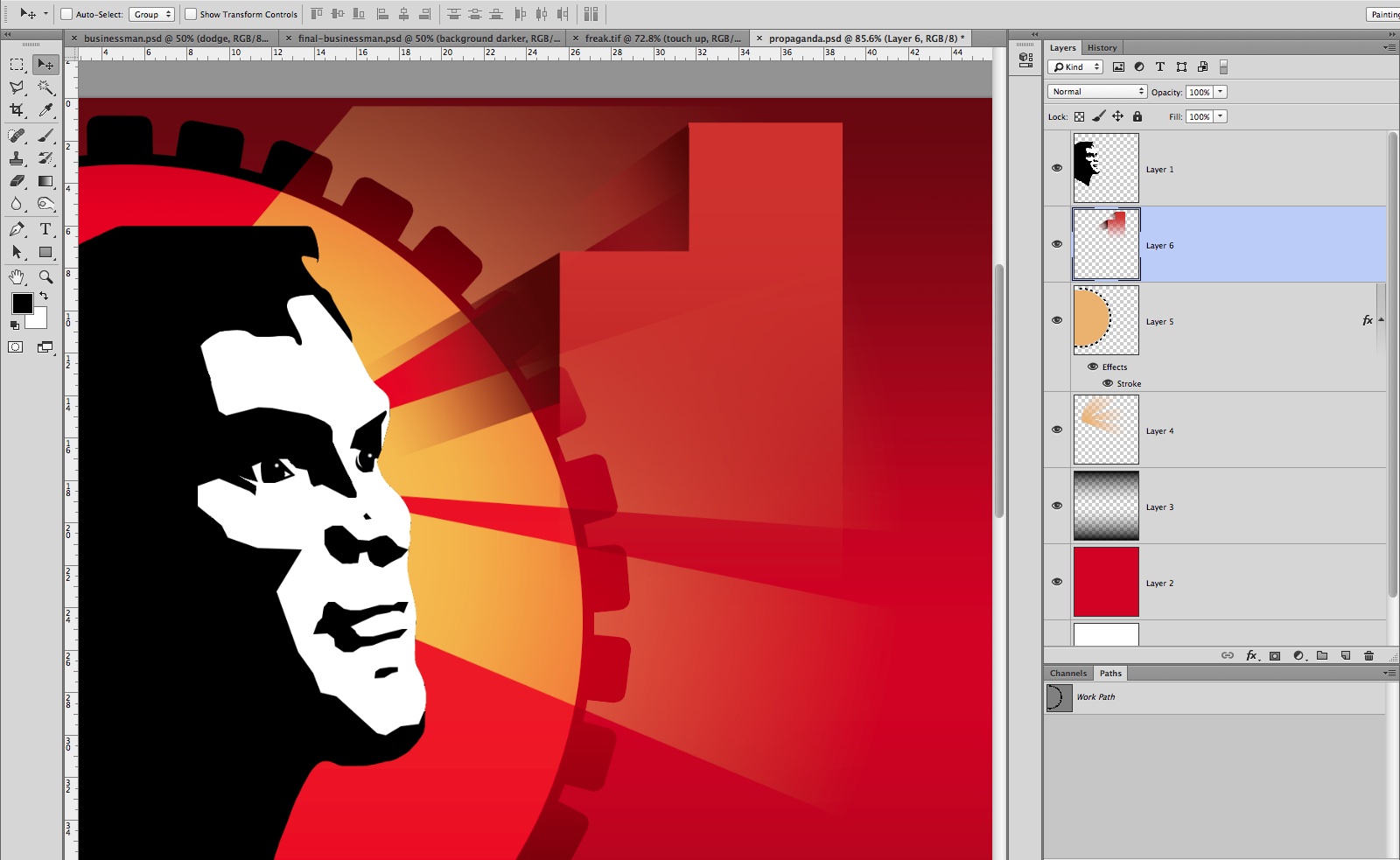 Create a new layer and fill it with R:222, G:36, B:20; to generate a vibrant red. Create another layer above it and, using the Gradient tool, make a Gradient at the top and bottom of the image so that both fade into the middle. Save the image to your hard drive and call it propaganda.psd.