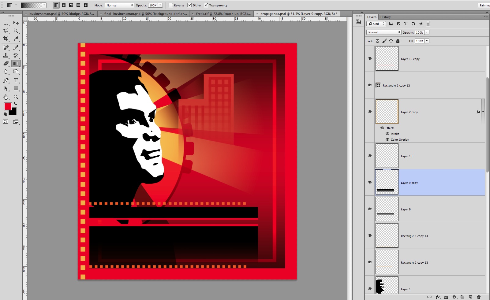 Using the above as guide, add a few borders and rectangular shapes, both above and below the head. Only the main block at the bottom of the illustration should be a Gradient; all the rest should be solid. Apply a variety of reds, then save the file.