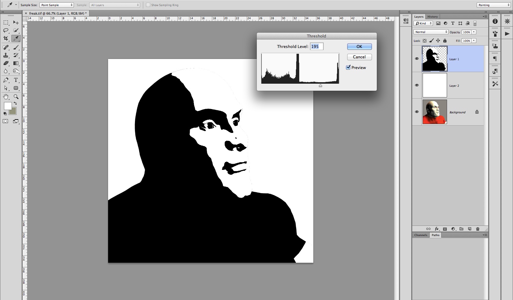 Select the top layer with the new head. Go to Image > Adjustments > Threshold and adjust the slider so the image looks a little like the screenshot above. Yours may vary slightly as the way you rendered your figure with lights in Poser will affect the result. Now click OK. Save this Photoshop file as freakhead.psd.