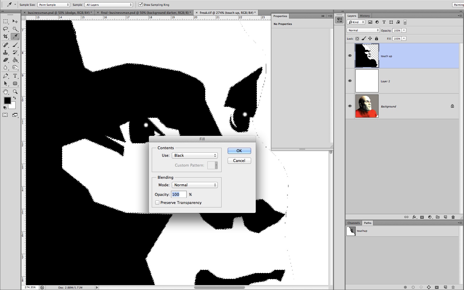 Now clean up the head by filling elements with black. Create a new layer in the Paths palette and rename it Touchup. Use the Zoom tool to magnify the left eye that faces you and select the Pen tool.